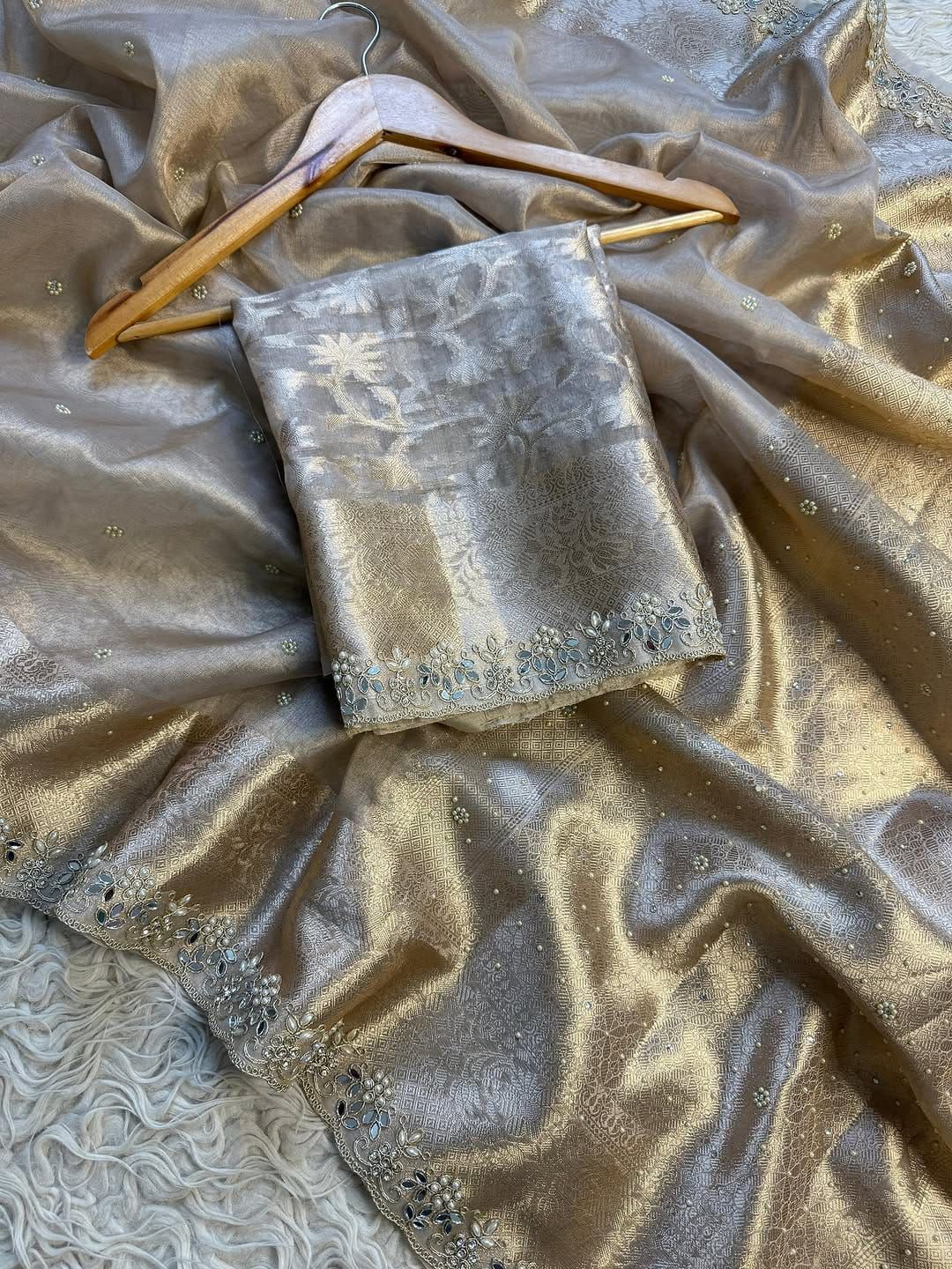 *Fabric* — banarasi SOFT MAHARANI GLASS TISSUE SILK saree collection. All over SIROKSI BEADS STONE WORK and hand work lace design rich pallu heavy stone embroidery and lace work