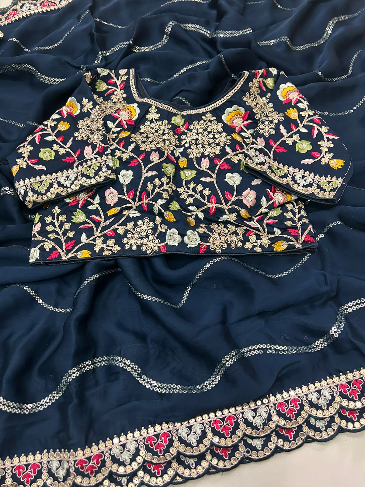 *BLOUSE : HEAVY MONO BANGLORY SILK FABRIC ON BEAUTIFUL EMBROIDERY 5 MM SEQUENCES WITH MULTI THREAD WORK ON BLOUSE*